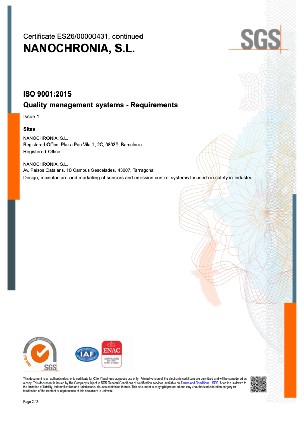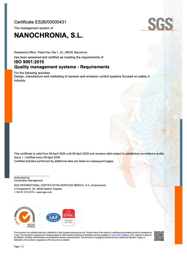 NanoChronia has achieved ISO 9001:2015 certification from SGS. This represents an important first step in our certification process that ensures the quality and safety of our sensors and emission control systems. The certification covers our design, manufacture, and marketing activities for our NanoSentry sensing system, targeting hazardous gases in energy, industry, and agriculture.